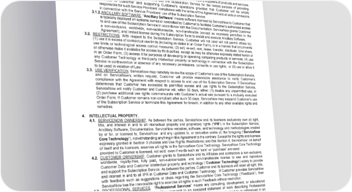 issued share capital of a company or the legal power to direct or cause direction of the general management of a legal entity. 3.1.1. THIRD PARTY SERVICE PROVIDERS. Customer may permit third party suppliers of products and services (“Service Providers”) to access and use the Subscription Service for the limited purpose of providing services to Customer and supporting Customer’s operations provided that Customer will be wholly responsible for such Service Providers’ compliance with the terms of this Agreement and all acts or omissions in connection with the Service Providers’ use of the Subscription Service. 3.1.2. ANCILLARY SOFTWARE. “Ancillary Software” means software licensed by ServiceNow to Customer that is typically deployed on systems owned or controlled by Customer to facilitate Customer’s authorized access to and use of the Subscription Service in accordance with the Documentation. ServiceNow grants Customer a non-exclusive, worldwide, non-sublicensable, non-transferable (except as expressly permitted in the Agreement), and limited license during the Subscription Term to install and execute Ancillary Software. 3.2. RESTRICTIONS. With respect to the Subscription Service, Customer will not (and will not permit others to): (1) use it in excess of contractual use limits (including as stated in an Order Form), or in a manner that circumvents use limits or technological access control measures; (2) sell, re-sell, rent, lease, transfer, distribute, time share, or otherwise make it available for access by third-parties, except as may be otherwise expressly stated herein or in an Order Form; (3) access it for purposes of developing or operating competing products or services; (4) use any Customer Technology or third-party intellectual property or technology in connection with the Subscription Service in contravention or absence of any necessary permissions, consents or use rights; or (5) use or allow it to be used in violation of Law. 3.3. USE VERIFICATION. ServiceNow may remotely review the scope of Customer’s use of the Subscription Service, and on ServiceNow’s written request, Customer will provide reasonable assistance to verify Customer’s compliance with the Agreement with respect to access to and use of the Subscription Service. If ServiceNow determines that Customer has exceeded its permitted access and use rights to the Subscription Service, ServiceNow will notify Customer and Customer will, within 30 days, either: (1) disable any unpermitted use; or (2) purchase additional use rights commensurate with Customer’s actual use pursuant to a mutually executed Order Form. If Customer remains non-compliant after such 30 days, ServiceNow may suspend Customer’s use of the Subscription Service or terminate this Agreement for breach, in addition to any other available rights and remedies. 4. INTELLECTUAL PROPERTY. 4.1. SERVICENOW OWNERSHIP. As between the parties, ServiceNow and its licensors exclusively own all right, title, and interest in and to all intellectual property and proprietary rights (“IPR”) in the Subscription Service, Ancillary Software, Documentation, ServiceNow websites, software, and technology and methodologies created by or for, or licensed to, ServiceNow and any updates to, or derivative works of, the foregoing (“ServiceNow Core Technology”), notwithstanding anything in this Agreement to the contrary. Except for the rights and licenses expressly granted in Section 3 (Access and Use Rights; Restrictions) and this Section 4, ServiceNow, on behalf of itself and its licensors, reserves all rights in the ServiceNow Core Technology. ServiceNow Core Technology provided to Customer is licensed, not sold, even if words such as “sale” or “purchase” are used. 4.2. CUSTOMER OWNERSHIP. Customer grants to ServiceNow and its Affiliates and contractors a non-exclusive, worldwide, royalty-free, fully paid, non-sublicensable, and non-transferable license to use and reproduce Customer Data and Customer intellectual property and technology (“Customer Technology”) solely to provide and support the Subscription Service. As between the parties, Customer and its licensors will retain all right, title, and interest in and to all IPR in Customer Data and Customer Technology. If Customer provides ServiceNow with feedback such as suggestions or ideas regarding the ServiceNow Core Technology (“Feedback”), then ServiceNow has the irrevocable right to exercise all rights in such Feedback without restriction. 4.3. PROFESSIONAL SERVICES. “Professional Services” means any consulting, development, or educational services provided by or for ServiceNow pursuant to an executed statement of work describing Professional Services (“SOW”) or written description for a packaged Professional Service, attached to or referenced in an Order Form (“Service Description”). Subject to this Section 4.3, ServiceNow assigns to Customer any Newly Created IP (defined below) upon Customer’s payment in full under the applicable SOW that specifies creation of the Newly Created IP. During the applicable Subscription Term, ServiceNow grants Customer a non-exclusive, worldwide, royalty-free, non-transferable (except as expressly set forth in the Agreement), non-sublicensable, and limited license to use the “Deliverables” (anything created for Customer in performance of Professional Services other than Newly Created IP) only in connection with the applicable Subscription Service for which it was built and Page 2 of 8 (Version: 12JUN2024) © 2023 ServiceNow, Inc. All rights reserved. ServiceNow, the ServiceNow logo, Now, Now Platform, and other ServiceNow marks are trademarks and/or registered trademarks of ServiceNow, Inc. in the United States and/or other countries. Other company and product names may be trademarks of the respective companies with which they are associated.