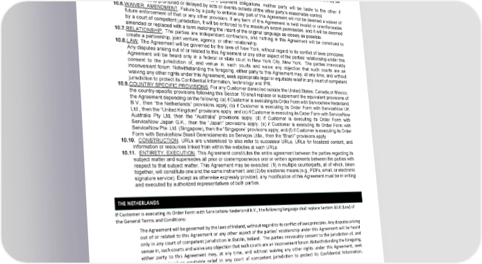 10.4. NOTICE. All notices will be in writing and deemed given to the addresses set forth in the applicable Order Form, except that email will not be sufficient for notices regarding any legal claim or alleged breach. Addresses may be subsequently updated in writing in accordance with this Agreement. 10.5. FORCE MAJEURE. Except for Customer’s payment obligations, neither party will be liable to the other if performance is prohibited or delayed by acts or events outside of the other party’s reasonable control. 10.6. WAIVER; AMENDMENT. Failure by a party to enforce any part of this Agreement will not be deemed a waiver of future enforcement of that or any other provision. If any term of this Agreement is held invalid or unenforceable by a court of competent jurisdiction, it will be enforced to the maximum extent permissible, and it will be deemed amended or replaced with a term matching the intent of the original language as closely as possible. 10.7. RELATIONSHIP. The parties are independent contractors, and nothing in this Agreement will be construed to create a partnership, joint venture, agency, or other relationship. 10.8. LAW. The Agreement will be governed by the laws of New York, without regard to its conflict of laws principles. Any disputes arising out of or related to this Agreement or any other aspect of the parties’ relationship under this Agreement will be heard only in a federal or state court in New York City, New York. The parties irrevocably consent to the jurisdiction of, and venue in, such courts and waive any objection that such courts are an inconvenient forum. Notwithstanding the foregoing, either party to this Agreement may, at any time, and without waiving any other rights under this Agreement, seek appropriate legal or equitable relief in any court of competent jurisdiction to protect its Confidential Information, technology and IPR. 10.9. COUNTRY SPECIFIC PROVISIONS. For any Customer domiciled outside the United States, Canada,or Mexico, the country-specific provisions following this Section 10 shall replace or supplement the equivalent provisions of the Agreement depending on the following: (a) if Customer is executing its Order Form with ServiceNow Nederland B.V., then “the Netherlands” provisions apply; (b) if Customer is executing its Order Form with ServiceNow UK Ltd., then the “United Kingdom” provisions apply; and (c) if Customer is executing its Order Form with ServiceNow Australia Pty Ltd, then the “Australia” provisions apply; (d) if Customer is executing its Order Form with ServiceNow Japan G.K., then the “Japan” provisions apply; (e) if Customer is executing its Order Form with ServiceNow Pte. Ltd. (Singapore), then the “Singapore” provisions apply; and (f) if Customer is executing its Order Form with ServiceNow Brasil Gerenciamento de Serviços Ltda., then the “Brazil” provisions apply. 10.10. CONSTRUCTION. URLs are understood to also refer to successor URLs, URLs for localized content, and information or resources linked from within the websites at such URLs. 10.11. ENTIRETY; EXECUTION. This Agreement constitutes the entire agreement between the parties regarding its subject matter and supersedes all prior or contemporaneous oral or written agreements between the parties with respect to that subject matter. This Agreement may be executed: (1) in multiple counterparts, all of which, taken together, will constitute one and the same instrument; and (2) by electronic means (e.g., PDFs, email, or electronic signature service). Except as otherwise expressly provided, any modification of this Agreement must be in writing and executed by authorized representatives of both parties. THE NETHERLANDS If Customer is executing its Order Form with ServiceNow Nederland B.V., the following language shall replace Section 10.8 (Law) of the General Terms and Conditions: The Agreement will be governed by the laws of Ireland, without regard to its conflict of laws principles. Any disputes arising out of or related to this Agreement or any other aspect of the parties’ relationship under this Agreement will be heard only in any court of competent jurisdiction in Dublin, Ireland. The parties irrevocably consent to the jurisdiction of, and venue in, such courts and waive any objection that such courts are an inconvenient forum. Notwithstanding the foregoing, either party to this Agreement may, at any time, and without waiving any other rights under this Agreement, seek appropriate legal or equitable relief in any court of competent jurisdiction to protect its Confidential Information, technology and IPR. UNITED KINGDOM If Customer is executing its Order Form with ServiceNow UK Ltd., the following language shall replace Section 10.8 (Law) of the General Term and Conditions: Page 6 of 8 (Version: 12JUN2024) © 2023 ServiceNow, Inc. All rights reserved. ServiceNow, the ServiceNow logo, Now, Now Platform, and other ServiceNow marks are trademarks and/or registered trademarks of ServiceNow, Inc. in the United States and/or other countries. Other company and product names may be trademarks of the respective companies with which they are associated.