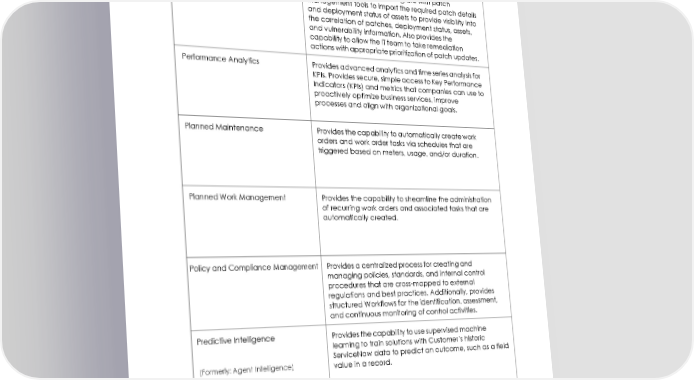 Password Reset Provides the capability to reset user passwords that are stored and pre-authenticated in a supported credential store separate from Customer’s instance of the subscription service, such as Microsoft Active Directory. Patch Orchestration Provides the capability to integrate with patch management tools to import the required patch details and deployment status of assets to provide visibility into the correlation of patches, deployment status, assets, and vulnerability information. Also provides the capability to allow the IT team to take remediation actions with appropriate prioritization of patch updates. Performance Analytics Provides advanced analytics and time series analysis for KPIs. Provides secure, simple access to Key Performance Indicators (KPIs) and metrics that companies can use to proactively optimize business services, improve processes and align with organizational goals. Planned Maintenance Provides the capability to automatically create work orders and work order tasks via schedules that are triggered based on meters, usage, and/or duration. Planned Work Management Provides the capability to streamline the administration of recurring work orders and associated tasks that are automatically created. Policy and Compliance Management Provides a centralized process for creating and managing policies, standards, and internal control procedures that are cross-mapped to external regulations and best practices. Additionally, provides structured Workflows for the identification, assessment, and continuous monitoring of control activities. Predictive Intelligence Provides the capability to use supervised machine learning to train solutions with Customer’s historic ServiceNow data to predict an outcome, such as a field (Formerly: Agent Intelligence) value in a record. 14 © 2022 ServiceNow, Inc. All rights reserved. ServiceNow, the ServiceNow logo, Now, Now Platform, and other ServiceNow marks are trademarks and/or registered trademarks of ServiceNow, Inc. in the United States and/or other countries. Other company and product names may be trademarks of the respective companies with which they are associated.