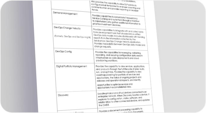 Data Loss Prevention Provides the capability to integrate with Data Loss Incident Response Prevention (DLP) products to import incidents from multiple sources such as endpoint, network, email, and cloud to enable remediation workflow involving end users, managers, and DLP operations team with automated incident assignment and escalations. Also provides the capability to allow DLP admins to configure email templates for end user coaching and communication and provides reporting on incident trends. Demand Management Provides capabilities to consolidate IT requests in a Service Catalog and route them through a Workflow to stakeholders who gather additional information to prioritize investment decisions. DevOps Change Velocity Provides capabilities to integrate with and collect data from development tools that is loaded into a unified DevOps data model. Includes dashboards with trending (Formerly: DevOps and DevOps Insights) reports from the information collected by the ServiceNow DevOps Change Velocity application. Provides traceability between DevOps data model and change requests. DevOps Config Provides the capabilities for managing, validating, recording, and securing configuration data used in infrastructure as code deployments and cloud provisioning workflows. Digital Portfolio Management Provides the capability to view services, applications, and products through the full lifecycle of plan, build, run, and optimize. Provides the capability to view roadmap planning for portfolio of services and applications, the status of ongoing projects and releases and operational impacts, and identify opportunities to optimize services and applications in a consolidated view. Discovery Locates physical and virtual devices connected to an enterprise network. When Discovery locates a device, it explores its configuration, status, software, and relationships to other connected devices, and updates the CMDB. Document Intelligence Provides a document processing capability to efficiently extract information from documents. 7 © 2022 ServiceNow, Inc. All rights reserved. ServiceNow, the ServiceNow logo, Now, Now Platform, and other ServiceNow marks are trademarks and/or registered trademarks of ServiceNow, Inc. in the United States and/or other countries. Other company and product names may be trademarks of the respective companies with which they are associated.
