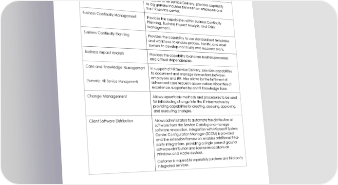 Automation Center Provides a central repository on the ServiceNow Platform to manage automations, oversee performance and key performance indicators (KPIs) of existing automations and jobs across multiple vendors in one dashboard, and offers guidance on new automation candidates. Basic Case Management In support of HR Service Delivery, provides capability to log general inquiries between an employee and the HR service center. Business Continuity Management Provides the capabilities within Business Continuity Planning, Business Impact Analysis, and Crisis Management. Business Continuity Planning Provides the capability to use standardized templates and workflows to enable process, facility, and asset owners to develop continuity and recovery plans. Business Impact Analysis Provides the capability to analyze business processes and critical dependencies. Case and Knowledge Management In support of HR Service Delivery, provides capabilities to document and manage interactions between employees and HR. Also allows for the fulfillment of (Formerly: HR Service Management) advanced case requests across various HR centers of excellence, supported by an HR Knowledge Base. Change Management Allows repeatable methods and procedures to be used for introducing change into the IT infrastructure by providing capabilities for creating, assessing, approving, and executing changes. Client Software Distribution Allows administrators to automate the distribution of software from the Service Catalog and manage software revocation. Integration with Microsoft System Center Configuration Manager (SCCM) is provided and the extension framework enables additional third- party integrations, providing a single pane of glass for software distribution and license revocations on Windows and Apple devices. Customer is required to separately purchase any third-party integrated services. 4 © 2022 ServiceNow, Inc. All rights reserved. ServiceNow, the ServiceNow logo, Now, Now Platform, and other ServiceNow marks are trademarks and/or registered trademarks of ServiceNow, Inc. in the United States and/or other countries. Other company and product names may be trademarks of the respective companies with which they are associated.