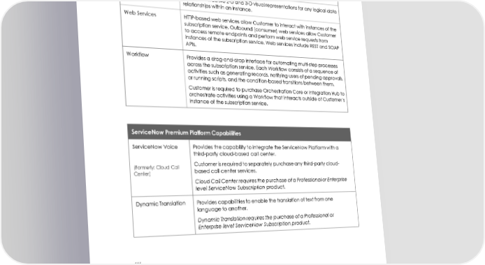Time Cards Records time worked on tasks either manually or automatically. Visual Task Boards Transforms the navigation of lists and forms into an interactive graphical experience including a Kanban-style workspace for either individual or team- based management of tasks. Visualizations Displays interactive 2-D and 3-D visual representations for any logical data relationships within an instance. Web Services HTTP-based web services allow Customer to interact with instances of the subscription service. Outbound (consumer) web services allow Customer to access remote endpoints and perform web service requests from instances of the subscription service. Web services include REST and SOAP APIs. Workflow Provides a drag-and-drop interface for automating multi-step processes across the subscription service. Each Workflow consists of a sequence of activities such as generating records, notifying users of pending approvals, or running scripts, and the condition-based transitions between them. Customer is required to purchase Orchestration Core or Integration Hub to orchestrate activities using a Workflow that interacts outside of Customer’s instance of the subscription service. ServiceNow Premium Platform Capabilities ServiceNow Voice Provides the capability to integrate the ServiceNow Platform with a third-party cloud-based call center. (Formerly: Cloud Call Customer is required to separately purchase any third-party cloud- Center) based call center services. Cloud Call Center requires the purchase of a Professional or Enterprise level ServiceNow Subscription product. Dynamic Translation Provides capabilities to enable the translation of text from one language to another. Dynamic Translation requires the purchase of a Professional or Enterprise level ServiceNow Subscription product. /// /// /// Remainder of page intentionally left blank 24 © 2022 ServiceNow, Inc. All rights reserved. ServiceNow, the ServiceNow logo, Now, Now Platform, and other ServiceNow marks are trademarks and/or registered trademarks of ServiceNow, Inc. in the United States and/or other countries. Other company and product names may be trademarks of the respective companies with which they are associated.