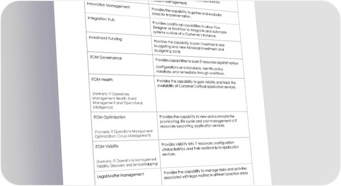 Incident Management Facilitates the process of restoring normal IT operations by providing capabilities to record, classify, distribute, and manage incidents through to resolution. Includes Performance Analytics limited to 15 key performance indicators (KPIs), one dashboard, and 90 days of data captured by Incident Management. Innovation Management Provides the capability to gather and evaluate ideas for implementation. Integration Hub Provides additional capabilities to allow Flow Designer or Workflow to integrate and automate systems outside of a Customer’s instance. Investment Funding Provides the capability to plan investments and budgeting and view historical investment and budgeting data. ITOM Governance Provides capabilities to scan IT resources against various configurations and standards, identify policy violations, and remediate through workflows. ITOM Health Provides the capability to gain visibility and track the availability of Customer’s critical application services. (Formerly: IT Operations Management Health; Event Management and Operational Intelligence) ITOM Optimization Provides the capability to view and automate the provisioning, life cycle and cost management of IT resources supporting application services. (Formerly: IT Operations Management Optimization; Cloud Management) ITOM Visibility Provides visibility into IT resources, configuration characteristics, and their relationship to application services. (Formerly: IT Operations Management Visibility; Discovery and ServiceMapping) Legal Matter Management Provides the capability to manage tasks and activities associated with legal matters in different practice areas. 11 © 2022 ServiceNow, Inc. All rights reserved. ServiceNow, the ServiceNow logo, Now, Now Platform, and other ServiceNow marks are trademarks and/or registered trademarks of ServiceNow, Inc. in the United States and/or other countries. Other company and product names may be trademarks of the respective companies with which they are associated.