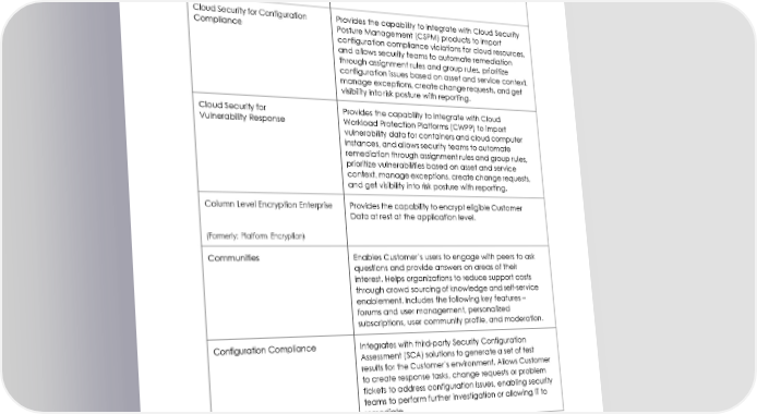 Cloud Insights Provides the capabilities to track, analyze, and manage cloud cost. Cloud Provisioning and Governance Provides the capability to automate the provisioning, lifecycle, and cost management of public and private cloud resources. (Formerly: Cloud Management) Cloud Security for Configuration Provides the capability to integrate with Cloud Security Compliance Posture Management (CSPM) products to import configuration compliance violations for cloud resources, and allows security teams to automate remediation through assignment rules and group rules, prioritize configuration issues based on asset and service context, manage exceptions, create change requests, and get visibility into risk posture with reporting. Cloud Security for Provides the capability to integrate with Cloud Vulnerability Response Workload Protection Platforms (CWPP) to import vulnerability data for containers and cloud computer instances, and allows security teams to automate remediation through assignment rules and group rules, prioritize vulnerabilities based on asset and service context, manage exceptions, create change requests, and get visibility into risk posture with reporting. Column Level Encryption Enterprise Provides the capability to encrypt eligible Customer Data at rest at the application level. (Formerly: Platform Encryption) Communities Enables Customer’s users to engage with peers to ask questions and provide answers on areas of their interest. Helps organizations to reduce support costs through crowd sourcing of knowledge and self-service enablement. Includes the following key features – forums and user management, personalized subscriptions, user community profile, and moderation. Configuration Compliance Integrates with third-party Security Configuration Assessment (SCA) solutions to generate a set of test results for the Customer’s environment. Allows Customer to create response tasks, change requests or problem tickets to address configuration issues, enabling security teams to perform further investigation or allowing IT to remediate. 5 © 2022 ServiceNow, Inc. All rights reserved. ServiceNow, the ServiceNow logo, Now, Now Platform, and other ServiceNow marks are trademarks and/or registered trademarks of ServiceNow, Inc. in the United States and/or other countries. Other company and product names may be trademarks of the respective companies with which they are associated.