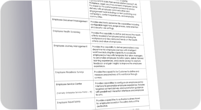 Edge Encryption Provides capabilities to encrypt eligible data in transit and at rest. Customer retains sole control and management of encryption keys. Employee Center Pro Provides the capability to access a unified portal for multi- department service delivery, enabling organizations to scale their service solutions across IT, HR, Workplace, Legal, and Procurement. Employee Center Pro expands the portal experience beyond service delivery with employee communication and engagement tools including content publishing and campaigns, content experiences, and employee communities. Employee Document Management Provides electronic personnel file capabilities including configurable legal hold, purge process, data retention and security rule settings. Employee Health Screening Provides the capability to define and record the health criteria required of employees before entering the workplace and view data and trends on the health criteria and return of employees. Employee Journey Management Provides the capability to deliver personalized cross- departmental employee journeys with intelligent workflows including the capability to accelerate employee journeys with templates that allow managers to personalize employee transition plans, deliver tailored learning experiences, and create surveys to capture feedback and gain insights to improve the employee experience. Employee Readiness Surveys Provides the capability for Customer to define and measure preparedness of its workforce through surveys. Employee Service Center Provides capabilities to configure an employee portal interface to personalize employee experience. Includes targeted content delivery and automation guidance (Formerly: Enterprise Service Portal – HR) with predefined interaction interfaces and employee forums. Employee Travel Safety Provides capabilities to authorize business travel for employees based on the safety status of the destination. Electronic Medical Records Provides the capability to open incidents using (EMR) Help Incident Management from within the EMR system. 8 © 2022 ServiceNow, Inc. All rights reserved. ServiceNow, the ServiceNow logo, Now, Now Platform, and other ServiceNow marks are trademarks and/or registered trademarks of ServiceNow, Inc. in the United States and/or other countries. Other company and product names may be trademarks of the respective companies with which they are associated.