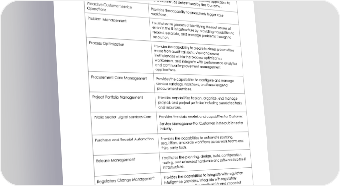 Privacy Management Provides capabilities to manage enterprise-wide privacy programs by enabling Customers to conduct privacy impact assessments, which determine what controls can be applied and automatically monitored to assist Customers with verifying their compliance with various privacy regulations and policies applicable to the Customer, as determined by the Customer. Proactive Customer Service Provides the capability to proactively trigger case Operations workflows. Problem Management Facilitates the process of identifying the root causes of errors in the IT infrastructure by providing capabilities to record, escalate, and manage problems through to resolution. Process Optimization Provides the capability to create business process flow maps from audit trail data, view and assess inefficiencies within the process optimization workbench, and integrate with performance analytics and continual improvement management applications. Procurement Case Management Provides the capabilities to configure and manage service catalogs, workflows, and knowledge for procurement services. Project Portfolio Management Provides capabilities to plan, organize, and manage projects and project portfolios including associated tasks and resources. Public Sector Digital Services Core Provides the data model, and capabilities for Customer Service Management for Customers in the public sector industry. Purchase and Receipt Automation Provides the capabilities to automate sourcing, requisition, and order workflows across work teams and third-party tools. Release Management Facilitates the planning, design, build, configuration, testing, and release of hardware and software into the IT infrastructure. Regulatory Change Management Provides the capabilities to integrate with regulatory intelligence providers, integrate with regulatory workflows to assess the applicability and impact of regulatory events, map the regulatory events with internal Government, Risk, and Compliance objects, 15 © 2022 ServiceNow, Inc. All rights reserved. ServiceNow, the ServiceNow logo, Now, Now Platform, and other ServiceNow marks are trademarks and/or registered trademarks of ServiceNow, Inc. in the United States and/or other countries. Other company and product names may be trademarks of the respective companies with which they are associated.