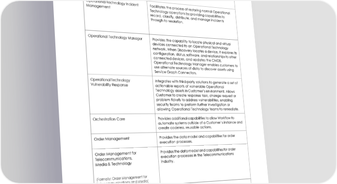 Network Inventory Core Provides core capabilities for customers in the telecommunications industry to model and represent their physical and virtual networks and the services provisioned on such networks. It includes the ability to manage network assets used to build and render the network. Operational Technology Incident Facilitates the process of restoring normal Operational Management Technology operations by providing capabilities to record, classify, distribute, and manage incidents through to resolution. Operational Technology Manager Provides the capability to locate physical and virtual devices connected to an Operational Technology network. When Discovery locates a device, it explores its configuration, status, software, and relationships to other connected devices, and updates the CMDB. Operational Technology Manager enables customers to use alternate sources of data to discover assets using Service Graph Connectors. Operational Technology Integrates with third-party solutions to generate a set of Vulnerability Response actionable reports of vulnerable Operational Technology assets in Customer’s environment. Allows Customer to create response task, change request or problem tickets to address vulnerabilities, enabling security teams to preform further investigation or allowing Operational Technology teams to remediate. Orchestration Core Provides additional capabilities to allow Workflow to automate systems outside of a Customer’s instance and create codeless, reusable actions. Order Management Provides the data model and capabilities for order execution processes. Order Management for Provides the data model and capabilities for order Telecommunications, execution processes in the Telecommunications Media & Technology industry. (Formally: Order Management for Telecommunications and Media) Outsourced Customer Service Provides the capability to manage outsourced customer service providers. 13 © 2022 ServiceNow, Inc. All rights reserved. ServiceNow, the ServiceNow logo, Now, Now Platform, and other ServiceNow marks are trademarks and/or registered trademarks of ServiceNow, Inc. in the United States and/or other countries. Other company and product names may be trademarks of the respective companies with which they are associated.