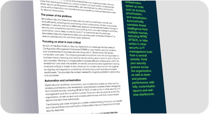 UUSE CSE CAASE GUSE GUIIDDEE Resolve security incidents and Digital security ® workflows, vulnerabilities fast with ServiceNow automation, and Security Operations orchestration Responding to security incidents and vulnerabilities is an ongoing process, and you speed up tasks know that reacting too slowly to a critical incident can have drastic consequences. such as analysis, When teams are frequently understaffed, yet overwhelmed by alerts, automation prioritization, along with orchestration can provide enormous benefit by making these teams able to respond more quickly. and remediation. The power of the platform Automatically ServiceNow Security Operations helps security teams scale faster, smarter and correlate threat more efficiently, enabling and automating critical collaboration of data and process intelligence from between IT, security, and risk to effectively respond and remediate threats. It brings in security and vulnerability data from your existing tools and uses intelligent workflows, multiple sources, automation, and a deep connection with IT to streamline security response. including MITRE ServiceNow Security Operations helps you use the power of the Now Platform® to reduce cybersecurity risk and drive cyber resilience. ATT&CK, or take Focusing on what is most critical action in other ® security or IT As part of the Now Platform, Security Operations can leverage the ServiceNow Configuration Management Database (CMDB) to map threats, security incidents, management tools and vulnerabilities to business services along with IT infrastructure, like servers, from a central computers, and users. This mapping enables prioritization and risk scoring based on business impact, ensuring your security teams are focused on what is most critical to console. Track your business. Working in a single platform enables efficient collaboration with IT for your security remediation and adds the benefits of visibility and service level agreement tracking to ensure nothing is missed. It also allows you to connect security and risk together posture across by aligning with regulatory compliance and ensuring correct business processes the organization, are followed. This provides the context needed for ongoing updates to cyber policy and processes. as well as team Automation and orchestration and process Digital security workflows, automation, and orchestration speed up tasks such as performance, with analysis, prioritization, and remediation. Automatically correlate threat intelligence fully-customizable from multiple sources, including MITRE ATT&CK, or take action in other security or IT management tools from a central console. Track your security posture across the reports and real- organization, as well as team and process performance, with fully-customizable time dashboards. reports and real-time dashboards. The following use cases will give you a better understanding of how you can benefit from the workflows and automation of ServiceNow Security Operations for faster security response. Scale resources with security Manage and resolve risks due automation and orchestration to high-pro昀椀le vulnerabilities Use playbooks and integrations Find and remediate application to accelerate security response vulnerabilities e昀昀ectively Know an attacker’s next move by Get real-time insights on security mapping incidents to MITRE ATT&CK posture and SOC performance via reporting Leverage work昀氀ows to proactively Defend against high-pro昀椀le monitor and resolve miscon昀椀gurations cyberattacks and reduce your 22 attack surface