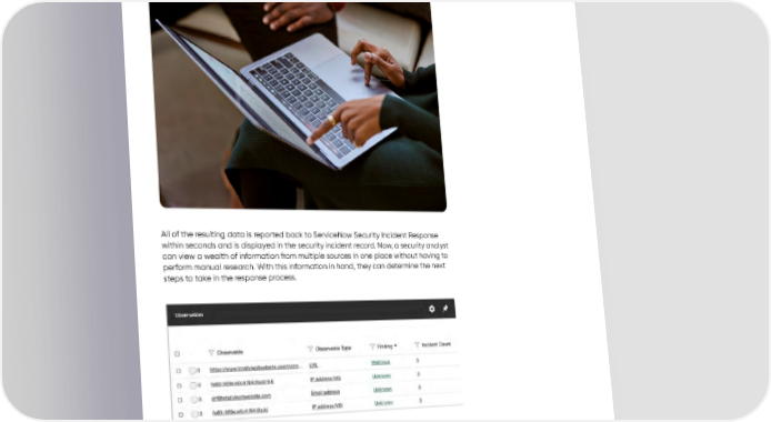 USE CASE GUIDE All of the resulting data is reported back to ServiceNow Security Incident Response within seconds and is displayed in the security incident record. Now, a security analyst can view a wealth of information from multiple sources in one place without having to perform manual research. With this information in hand, they can determine the next steps to take in the response process. Perhaps in this case, the next step is to create a firewall block request to prevent malware from exfiltrating data. Again, orchestration can be used by the analyst to create the block request in a couple of clicks without leaving ServiceNow. This saves time and also creates a traceable record as to why the block request was created. You can even choose to fully automate workflows within a response if desired. Security Operations can notify analysts of the steps taken in case they wish to make changes. 4