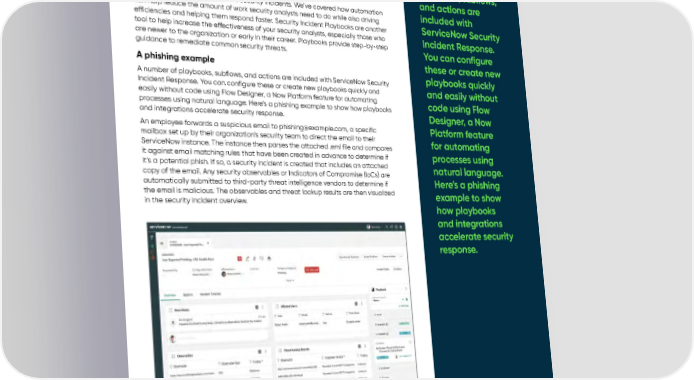 UUSE CSE CAASE GUSE GUIIDDEE Use playbooks and integrations to A number of accelerate security incident response playbooks, subflows, and actions are Speed is critical when it comes to security incidents. We’ve covered how automation included with can help reduce the amount of work security analysts need to do while also driving ServiceNow Security efficiencies and helping them respond faster. Security Incident Playbooks are another tool to help increase the effectiveness of your security analysts, especially those who Incident Response. are newer to the organization or early in their career. Playbooks provide step-by-step You can configure guidance to remediate common security threats. A phishing example these or create new A number of playbooks, subflows, and actions are included with ServiceNow Security playbooks quickly Incident Response. You can configure these or create new playbooks quickly and and easily without easily without code using Flow Designer, a Now Platform feature for automating code using Flow processes using natural language. Here’s a phishing example to show how playbooks and integrations accelerate security response. Designer, a Now An employee forwards a suspicious email to [email protected], a specific Platform feature mailbox set up by their organization’s security team to direct the email to their for automating ServiceNow instance. The instance then parses the attached .eml file and compares it against email matching rules that have been created in advance to determine if processes using it’s a potential phish. If so, a security incident is created that includes an attached natural language. copy of the email. Any security observables or Indicators of Compromise (IoCs) are automatically submitted to third-party threat intelligence vendors to determine if Here’s a phishing the email is malicious. The observables and threat lookup results are then visualized example to show in the security incident overview. how playbooks and integrations accelerate security response. 55
