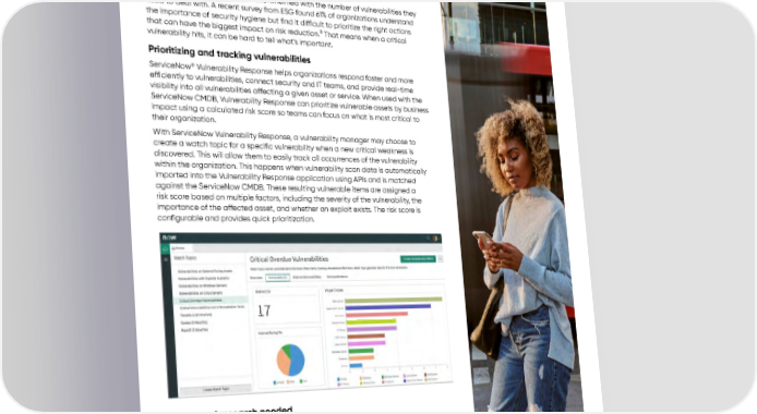 USE CASE GUIDE Manage and resolve risks due to high-profile vulnerabilities Many organizations find they’re overwhelmed with the number of vulnerabilities they need to deal with. A recent survey from ESG found 61% of organizations understand the importance of security hygiene but find it difficult to prioritize the right actions that can have the biggest impact on risk reduction.3 That means when a critical vulnerability hits, it can be hard to tell what’s important. Prioritizing and tracking vulnerabilities ® ServiceNow Vulnerability Response helps organizations respond faster and more efficiently to vulnerabilities, connect security and IT teams, and provide real-time visibility into all vulnerabilities affecting a given asset or service. When used with the ServiceNow CMDB, Vulnerability Response can prioritize vulnerable assets by business impact using a calculated risk score so teams can focus on what is most critical to their organization. With ServiceNow Vulnerability Response, a vulnerability manager may choose to create a watch topic for a specific vulnerability when a new critical weakness is discovered. This will allow them to easily track all occurrences of the vulnerability within the organization. This happens when vulnerability scan data is automatically imported into the Vulnerability Response application using APIs and is matched against the ServiceNow CMDB. These resulting vulnerable items are assigned a risk score based on multiple factors, including the severity of the vulnerability, the importance of the affected asset, and whether an exploit exists. The risk score is configurable and provides quick prioritization. No manual research needed Information about the vulnerability (e.g., what it is, how it’s exploited, and how to remediate the threat) is automatically pulled into Vulnerability Response from the National Vulnerability Database (NVD) and other third-party sources, eliminating the need for manual research. If a known solution exists from Microsoft or Red Hat’s databases, that will also be included with the remediation information. Configurable dashboards quickly show the organization’s overall vulnerability exposure. Grouping and prioritization work together to make the volume of vulnerabilities manageable. Instead of dealing with thousands of individual vulnerable items, you can work with a much smaller number of groups and handle prioritization and remediation at the group level. 11 3 ESG Research Study, Security Hygiene and Posture Management, 2021