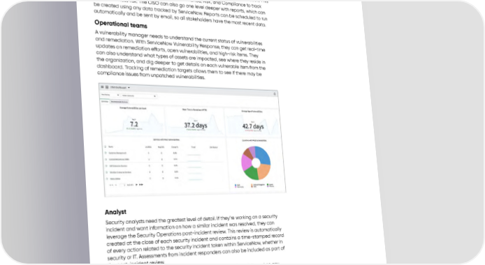 USE CASE GUIDE Risk exposure consists of multiple factors, including security incidents, vulnerabilities, and software configurations. Because all of these issues are prioritized by how critical they are to the business in the ServiceNow CMDB, the dashboard can show the current number of critical versus non-critical open issues across the organization. This data can also be used in ServiceNow Governance, Risk, and Compliance to track overall business risk. The CISO can also go one level deeper with reports, which can be created using any data tracked by ServiceNow. Reports can be scheduled to run automatically and be sent by email, so all stakeholders have the most recent data. Operational teams A vulnerability manager needs to understand the current status of vulnerabilities and remediation. With ServiceNow Vulnerability Response, they can get real-time updates on remediation efforts, open vulnerabilities, and high-risk items. They can also understand what types of assets are impacted, see where they reside in the organization, and dig deeper to get details on each vulnerable item from the dashboard. Tracking of remediation targets allows them to see if there may be compliance issues from unpatched vulnerabilities. Analyst Security analysts need the greatest level of detail. If they’re working on a security incident and want information on how a similar incident was resolved, they can leverage the Security Operations post-incident review. This review is automatically created at the close of each security incident and contains a time-stamped record of every action related to the security incident taken within ServiceNow, whether in security or IT. Assessments from incident responders can also be included as part of the post-incident review. Analysts can also build their own custom reports and dashboards based on any information they have access to in ServiceNow with Performance Analytics. These can help identify patterns or potential issues 16