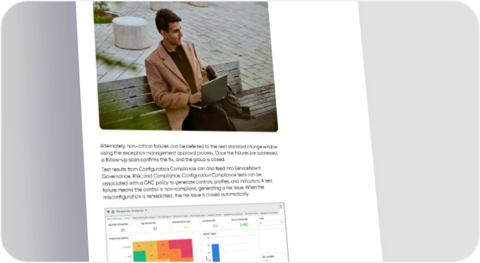 USE CASE GUIDE Alternately, non-critical failures can be deferred to the next standard change window using the exception management approval process. Once the failures are addressed, a follow-up scan confirms the fix, and the group is closed. Test results from Configuration Compliance can also feed into ServiceNow® Governance, Risk, and Compliance. Configuration Compliance tests can be associated with a GRC policy to generate controls, profiles, and indicators. A test failure means the control is non-compliant, generating a risk issue. When the misconfiguration is remediated, the risk issue is closed automatically. 10