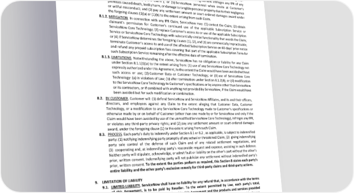 8.1.1. OBLIGATION. Subject to this Section 8, ServiceNow will: (1) defend Customer and Customer Affiliates, and its and their officers, directors, and employees against any Claim to the extent alleging any: (a) ServiceNow Core Technology used in accordance with this Agreement infringes any IPR of any unaffiliated third party (“IPR Claim”); or (b) ServiceNow personnel when onsite at Customer’s premises caused death, bodily harm, or damage to tangible personal property due to their negligence or willful misconduct; and (2) pay any settlement amount or court-ordered damages award under the forgoing clauses (1)(a) or (1)(b) to the extent arising from such Claim. 8.1.2. M ITIGATION. In connection with any IPR Claim, ServiceNow may: (1) contest the Claim; (2) obtain claimant’s permission for Customer’s continued use of the applicable Subscription Service or ServiceNow Core Technology; (3) replace Customer’s access to or use of the applicable Subscription Service or ServiceNow Core Technology with substantially similar functionality that avoids the Claim; or (4) if ServiceNow determines the foregoing clauses (1), (2), and (3) are commercially impracticable, terminate Customer’s access to and use of the affected Subscription Service on 60-days’ prior notice and refund any prepaid subscription fees covering that part of the applicable Subscription Term for such Subscription Service remaining after the effective date of termination. 8.1.3. LIMITATIONS. Notwithstanding the above, ServiceNow has no obligation or liability for any Claim under Section 8.1.1(1)(a) to the extent arising from: (1) use of any ServiceNow Core Technology not expressly authorized under this Agreement, to the extent the Claim would have been avoided without such access or use; (2) Customer Data or Customer Technology; or (3) use of ServiceNow Core Technology: (a) in violation of Law; (b) after termination under Section 8.1.2(4); or (4) modification to the ServiceNow Core Technology to Customer’s specifications or by anyone other than ServiceNow or its contractors, or if combined with anything not provided by ServiceNow, if the Claim would have been avoided but for such modification or combination. 8.2. BY CUSTOMER. Customer will: (1) defend ServiceNow and ServiceNow Affiliates, and its and their officers, directors, and employees against any Claim to the extent alleging that Customer Data, Customer Technology, or a modification to any ServiceNow Core Technology made to Customer’s specifications or otherwise made by or on behalf of Customer (other than one made by or for ServiceNow and only if the Claim would have been avoided by use of the unmodified ServiceNow Core Technology), infringes any IPR, or violates any third-party privacy rights; and (2) pay any settlement amount or court-ordered damages award, under the foregoing clause (1) to the extent arising from such Claim. 8.3. PROCESS. Each party’s duty to indemnify under Section 8.1 or 8.2 , as applicable, is subject to indemnified party: (1) notifying indemnifying party promptly of any actual or threatened Claim, (2) giving indemnifying party sole control of the defense of such Claim and of any related settlement negotiations, and (3) cooperating and, at indemnifying party’s reasonable request and expense, assisting in such defense. Neither party will stipulate, acknowledge, or admit fault or liability on the other’s part without the other’s prior, written consent. Indemnifying party will not publicize any settlement without indemnified party’s prior, written consent. To the extent the parties perform as required, this Section 8 states each party’s entire liability and the other party’s exclusive remedy for third-party claims and third-party actions. 9. LIMITATION OF LIABILITY 9.1. LIMITED LIABILITY. ServiceNow shall have no liability for any refund that, in accordance with the terms of this Agreement, is to be paid by Reseller. To the extent permitted by Law, each party’s total, cumulative liability arising out of or related to this Agreement and the products and services provided under it, whether based on contract, tort (including negligence), or any other legal or equitable theory, will be limited to the amounts paid by Customer for use of the products or provision of the services giving rise to the claim during the 12-month period preceding the first event giving rise to liability. Multiple claims will not enlarge this limit. 6 11 Page of (Version: 17November2022) © 2022 ServiceNow, Inc. All rights reserved. ServiceNow, the ServiceNow logo, Now, Now Platform, and other ServiceNow marks are trademarks and/or registered trademarks of ServiceNow, Inc. in the United States and/or other countries. Other company and product names may be trademarks of the respective companies with which they are associated.
