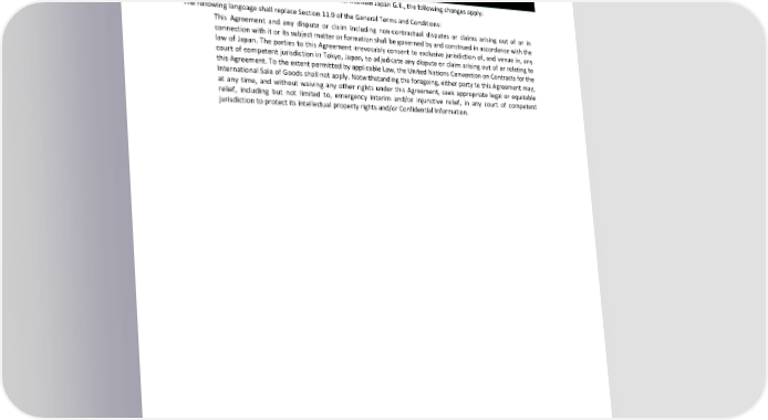 JAPAN If Customer is executing its Use Authorization with ServiceNow Japan G.K., the following changes apply: The following language shall replace Section 11.9 of the General Terms and Conditions: This Agreement and any dispute or claim including non-contractual disputes or claims arising out of or in connection with it or its subject matter or formation shall be governed by and construed in accordance with the law of Japan. The parties to this Agreement irrevocably consent to exclusive jurisdiction of, and venue in, any court of competent jurisdiction in Tokyo, Japan, to adjudicate any dispute or claim arising out of or relating to this Agreement. To the extent permitted by applicable Law, the United Nations Convention on Contracts for the International Sale of Goods shall not apply. Notwithstanding the foregoing, either party to this Agreement may, at any time, and without waiving any other rights under this Agreement, seek appropriate legal or equitable relief, including but not limited to, emergency interim and/or injunctive relief, in any court of competent jurisdiction to protect its intellectual property rights and/or Confidential Information. 11 11 Page of (Version: 17November2022) © 2022 ServiceNow, Inc. All rights reserved. ServiceNow, the ServiceNow logo, Now, Now Platform, and other ServiceNow marks are trademarks and/or registered trademarks of ServiceNow, Inc. in the United States and/or other countries. Other company and product names may be trademarks of the respective companies with which they are associated.