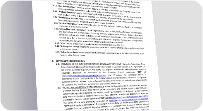 1.10. “Law” means any applicable law, rule, statute, decree, decision, order, regulation, judgment, code, and requirement of any government authority (federal, state, local, or international) having jurisdiction. 1.11. “Newly Created IP” means IPR in inventions or works of authorship newly created by ServiceNow specifically for Customer and expressly identified as “Newly Created IP” in an SOW. No ServiceNow Core Technology (or anything else not newly created in the course of performing the applicable Professional Services described in the SOW) may be construed to be Newly Created IP. 1.12. “Use Authorization” means a written document provided to Customer specifying the products and services purchased by Customer and the term and scope of their authorized use. 1.13. “Product Overview” means ServiceNow’s published description of its products and the functionality of such products, solely to the extent attached to or expressly referenced in a Use Authorization. 1.14. “Professional Services” means any consulting, development, or educational services provided by or for ServiceNow pursuant to an agreed upon SOW or Service Description. 1.15. “Service Description” means the written description for a packaged Professional Service, attached to or referenced in a Use Authorization. 1.16. “ServiceNow Core Technology” means: (1) the Subscription Service, Ancillary Software, Documentation, and technology and methodologies (including products, software tools, hardware designs, algorithms, templates, software (in source and object forms), architecture, class libraries, objects, and documentation) created by or for, or licensed to, ServiceNow; and (2) updates, upgrades, improvements, configurations, extensions, and derivative works of the foregoing and related documentation. 1.17. “SOW” means a statement of work that describes scoped Professional Services. 1.18. “Subscription Service” means the ServiceNow software-as-a-service offering ordered by Customer under a Use Authorization. 1.19. “Subscription Term” means the period of authorized access to and use of the Subscription Service, as set forth in a Use Authorization. 2. SERVICENOW RESPONSIBILITIES 2.1. PROVISION OF THE SUBSCRIPTION SERVICE; COMPLIANCE WITH LAWS. During the Subscription Term, ServiceNow will: (1) make the Subscription Service available to Customer pursuant to this Agreement, and (2) provide Customer Support, an Availability SLA, Upgrades and Updates, and ServiceNow’s Insurance Coverage disclosure as described in the Customer Support Addendum (“CSA”) at https://www.servicenow.com/upgrade-schedules.html; and (3) provide the Subscription Service in accordance with all Laws applicable to ServiceNow’s provision of the products and services to its general customer base (i.e., without regard to Customer’s particular use of the Subscription Service or Laws specific to Customer and its industry not otherwise applicable to ServiceNow). 2.2. PROTECTION AND RETURN OF CUSTOMER DATA. During the Subscription Term, ServiceNow will maintain a written Security Program that includes policies, procedures and controls aligned to ISO27001, or a substantially equivalent standard, that includes industry-standard practices designed to protect Customer Data from accidental or unlawful destruction, loss, alteration, unauthorized disclosure, or access as https://www.servicenow.com/upgrade-schedules.html. described in the data security addendum (“DSA”) at The terms of the data processing addendum at https://www.servicenow.com/upgrade-schedules.html (“DPA”) shall apply to ServiceNow’s Processing of Personal Data (as defined in the DPA). Upon written request by Customer within 45 days after termination or expiration of this Agreement (or termination or expiration of a Use Authorization), ServiceNow will provide any Customer Data in the Subscription Service to Customer in ServiceNow’s standard database export format at no additional charge. After such 45 day period, ServiceNow shall have no obligation to maintain or provide any Customer Data and will, unless legally prohibited, delete all Customer Data in its systems or otherwise in its possession or under its control, delete Customer’s instances of the Subscription Service, and upon written request, provide confirmation of such deletion. 2 11 Page of (Version: 17November2022) © 2022 ServiceNow, Inc. All rights reserved. ServiceNow, the ServiceNow logo, Now, Now Platform, and other ServiceNow marks are trademarks and/or registered trademarks of ServiceNow, Inc. in the United States and/or other countries. Other company and product names may be trademarks of the respective companies with which they are associated.
