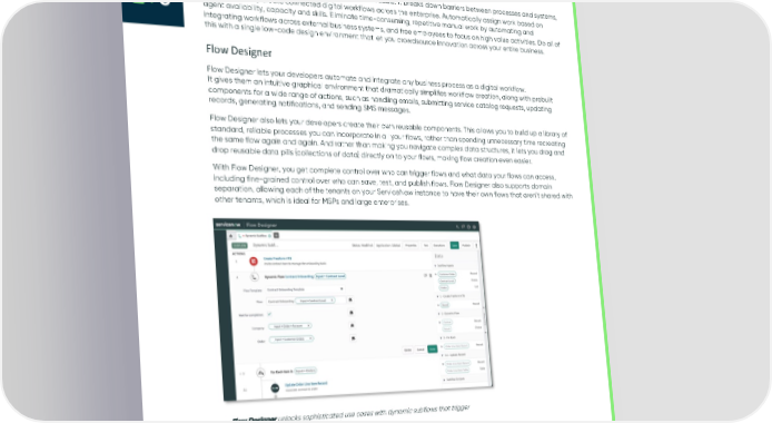 Accelerating enterprise automation The Now Platform lets you automate the enterprise at scale. It breaks down barriers between processes and systems, letting you easily create connected digital workflows across the enterprise. Automatically assign work based on agent availability, capacity and skills. Eliminate time-consuming, repetitive manual work by automating and integrating workflows across external business systems, and free employees to focus on high value activities. Do all of this with a single low-code design environment that let you crowdsource innovation across your entire business. Flow Designer Flow Designer lets your developers automate and integrate any business process as a digital workflow. It gives them an intuitive graphical environment that dramatically simplifies workflow creation, along with prebuilt components for a wide range of actions, such as handling emails, submitting service catalog requests, updating records, generating notifications, and sending SMS messages. Flow Designer also lets your developers create their own reusable components. This allows you to build up a library of standard, reliable processes you can incorporate in all your flows, rather than spending unnecessary time recreating the same flow again and again. And rather than making you navigate complex data structures, it lets you drag and drop reusable data pills (collections of data) directly on to your flows, making flow creation even easier. With Flow Designer, you get complete control over who can trigger flows and what data your flows can access, including fine-grained control over who can save, test, and publish flows. Flow Designer also supports domain separation, allowing each of the tenants on your ServiceNow instance to have their own flows that aren’t shared with other tenants, which is ideal for MSPs and large enterprises. Flow Designer unlocks sophisticated use cases with dynamic subflows that trigger actions based on run-time parameters. © 2022 ServiceNow, Inc. All Rights Reserved. Confidential. 18
