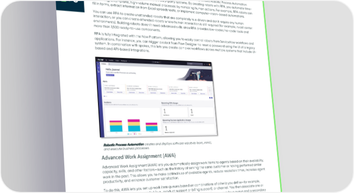 Robotic Process Automation In addition to API-based integration using spokes, the Now Platform also provides Robotic Process Automation (RPA), which interacts with user interfaces on third-party systems. By creating robots with RPA, you automate time- consuming, error-prone, high-volume manual processes by mimicking human actions. For example, RPA robots can fill in forms, extract information from Excel spreadsheets, or implement computer-vision-based automations. You can use RPA to create unattended robots that are completely rule driven and don’t require any human interaction, or you can create attended robots where human interaction is still required (for example, in call center environments). Building robots doesn’t need advanced skills since RPA provides low-codes/no-code tools and more than 1,500 ready-to-use components. RPA is fully integrated with the Now Platform, allowing you to easily control robots from ServiceNow workflows and applications. For instance, you can trigger a robot from Flow Designer to reset a password using the UI of a legacy system. In combination with spokes, this lets you create complex workflows across multiple systems that include UI- based and API-based integrations. Robotic Process Automation creates and deploys software robots to learn, mimic, and execute business processes. Advanced Work Assignment (AWA) Advanced Work Assignment (AWA) lets you automatically assign work items to agents based on their availability, capacity, skills, and other factors—such as the history of serving the same customer or having performed similar work in the past. This allows you to make optimal use of available agents, reduce resolution times, increase agent productivity, and enhance customer satisfaction. To do this, AWA lets you set up work item queues based on combinations of criteria you define—for example, priority, type of support needed (e.g., product support or billing support), or channel. You then associate one or more agent groups with each queue. For instance, you could have a primary group for a queue and a secondary group that handles overflow work in the queue. AWA then assigns work items from each queue to specific agents in associated user groups based on their skills, availability, and other criteria you have configured. AWA comes with default channels, such as chat, customer service cases, incidents, SMS, Facebook, and WhatsApp, and you can also define your own custom service channels. © 2022 ServiceNow, Inc. All Rights Reserved. Confidential. 21