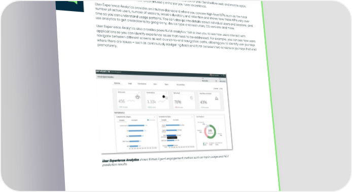 User Experience Analytics User Experience Analytics lets you understand usage and adoption of your ServiceNow web and mobile apps, providing the insights you need to continuously enhance your user experience. User Experience Analytics provides an intuitive dashboard where you can see high-level KPIs such as the total number of active users, number of sessions, session duration, and retention and shows how these KPIs vary over time so you can understand usage patterns. You can also go into details about individual users and sessions, and use analytics to get breakdowns by geography, device type and resolution, OS versions and more. User Experience Analytics also provides powerful UI analytics that allows you to see how users interact with applications so you can identify experience issues that need to be addressed. For example, you can see how users navigate between different screens as well as end-to-end navigation paths, allowing you to identify user journeys where there are issues – such as continuously navigating back and forth between two screens or journeys that end prematurely. User Experience Analytics shows Virtual Agent engagement metrics such as topic usage and NLU prediction results. © 2022 ServiceNow, Inc. All Rights Reserved. Confidential. 11