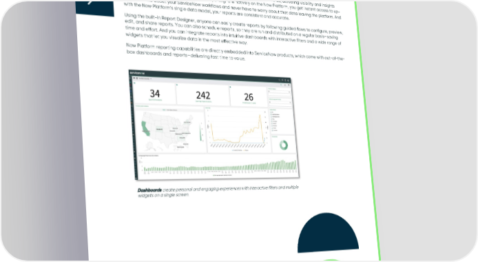 Reports and dashboards With the Now Platform, you can easily create and share reports and dashboards, delivering visibility and insights across your entire organization. Because reporting runs natively on the Now Platform, you get instant access to up- to-date data about your ServiceNow workflows and never have to worry about that data leaving the platform. And with the Now Platform’s single data model, your reports are consistent and accurate. Using the built-in Report Designer, anyone can easily create reports by following guided flows to configure, preview, edit, and share reports. You can also schedule reports, so they are run and distributed on a regular basis—saving time and effort. And you can integrate reports into intuitive dashboards with interactive filters and a wide range of widgets that let you visualize data in the most effective way. Now Platform reporting capabilities are directly embedded into ServiceNow products, which come with out-of-the- box dashboards and reports—delivering fast time to value. Dashboards create personal and engaging experiences with interactive filters and multiple widgets on a single screen. © 2022 ServiceNow, Inc. All Rights Reserved. Confidential. 15