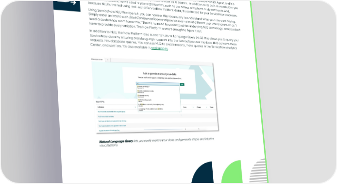 Natural Language Processing Natural Language Understanding (NLU) is the AI technology that powers the ServiceNow Virtual Agent, and it is also incorporated into other ServiceNow applications such as AI Search. In addition to its built-in vocabulary, you can also add specific terms used in your organization, such as the names of systems or departments. And, because NLU is trained using real-world ServiceNow incident data, it’s optimized for your ServiceNow processes. Using ServiceNow NLU Workbench, you can harness this vocabulary to understand what your users are saying. Simply enter an intent such BookConferenceRoomand provide examples of different user utterances such as “I need a conference room tomorrow.” There’s no need to understand the underlying NLU technology, and you don’t have to provide every variation. The Now Platform is smart enough to figure it out. In addition to NLU, the Now Platform also supports Natural Language Query (NLQ). This allows you to query your ServiceNow data by entering plain language requests into the ServiceNow user interface. NLQ converts these requests into database queries. You can use NLQ to create reports, make queries in the ServiceNow Analytics Center, and sort lists. It’s also available in workspaces. Natural Language Query lets you easily explore your data and generate simple and intuitive visualizations. © 2022 ServiceNow, Inc. All Rights Reserved. Confidential. 24