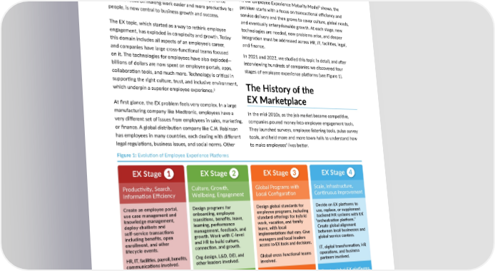 s businesses deal with constant economic, industrial, and industries like healthcare have to support nurses, drivers, and A technological change, employee experience has become administrators. How can a company build an EX strategy that a CEO-level issue. Today, more than 81% of employees feel scales, given these many dimensions of complexity? 1 burned out and despite an economic slowdown, almost a third 3 of workers will change jobs this year. Employee experience As our Employee Experience Maturity Model shows, the problem starts with a focus on transac琀椀onal e昀케ciency and (EX), the focus on making work easier and more produc琀椀ve for service delivery and then grows to cover culture, global needs, people, is now central to business growth and success. and eventually enterprisewide growth. At each stage, new The EX topic, which started as a way to rethink employee technologies are needed, new problems arise, and deeper engagement, has exploded in complexity and growth. Today integra琀椀on must be addressed across HR, IT, facili琀椀es, legal, this domain includes all aspects of an employee’s career, and 昀椀nance. and companies have large cross-func琀椀onal teams focused In 2021 and 2022, we studied this topic in detail, and a昀琀er on it. The technologies for employees have also exploded— interviewing hundreds of companies we discovered four billions of dollars are now spent on employee portals, apps, stages of employee experience pla琀昀orms (see Figure 1). collabora琀椀on tools, and much more. Technology is cri琀椀cal in suppor琀椀ng the right culture, trust, and inclusive environment, The History of the which underpin a superior employee experience.2 EX Marketplace At 昀椀rst glance, the EX problem feels very complex. In a large manufacturing company like Medtronic, employees have a In the mid-2010s, as the job market became compe琀椀琀椀ve, very di昀昀erent set of issues from employees in sales, marke琀椀ng, companies poured money into employee engagement tools. or 昀椀nance. A global distribu琀椀on company like C.H. Robinson They launched surveys, employee listening tools, pulse survey has employees in many countries, each dealing with di昀昀erent tools, and held more and more town halls to understand how legal regula琀椀ons, business issues, and social norms. Other to make employees' lives be琀琀er. Figure 1: Evolu琀椀on of Employee Experience Pla琀昀orms EX Stage 1 EX Stage 2 EX Stage 3 EX Stage 4 Produc琀椀vity, Search, Culture, Growth, Global Programs with Scale, Infrastructure, Informa琀椀on Efficiency Wellbeing, Engagement Local Configura琀椀on Con琀椀nuous Improvement Create an employee portal, Design programs for Design global standards for Decide on EX pla琀昀orms to use case management and onboarding, employee employee programs, including use, replace, or supplement knowledge management, transi琀椀ons, benefits, leave, standard offerings for hybrid backend HR systems with EX deploy chatbots and learning, performance work, vaca琀椀on, and family “orchestra琀椀on pla琀昀orm.” self-service transac琀椀ons management, feedback, and leave, with local Create global alignment including benefits, open growth. Work with C-level implementa琀椀ons that vary. Give between local businesses and enrollment, and other and HR to build culture, managers and local leaders global service centers. lifecycle events. connec琀椀on, and growth. access to EX tools and decisions. HR, IT, facili琀椀es, payroll, benefits, Org design, L&D, DEI, and IT, digital transforma琀椀on, HR communica琀椀ons involved. other leaders involved. Global cross func琀椀onal teams opera琀椀ons, and business involved. partners involved. Make work easier. Make work meaningful. Scale EX globally. Create global EX pla琀昀orms. Source: The Josh Bersin Company, 2022 1 Global Talent Trends, 2022 Study: Rise of the relatable organiza琀椀on, Mercer, 2022. 3 The De昀椀ni琀椀ve Guide: Employee Experience, Josh Bersin and Kathi Enderes, PhD/The Josh 2 “The Important Role of Technology,” The De昀椀ni琀椀ve Guide: Employee Experience, Josh Bersin Bersin Company, 2022. and Kathi Enderes, PhD/The Josh Bersin Company, 2021. The Rise of the Employee Experience Pla琀昀orm: Essen琀椀al to Business Success | Copyright © 2022 The Josh Bersin Company 2 All rights reserved. Not for distribu琀椀on. Licensed material.