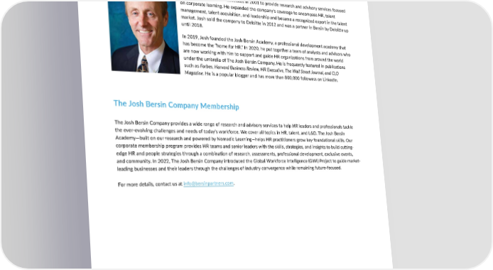 About the Author Josh Bersin Josh founded Bersin & Associates in 2001 to provide research and advisory services focused on corporate learning. He expanded the company’s coverage to encompass HR, talent management, talent acquisition, and leadership and became a recognized expert in the talent market. Josh sold the company to Deloitte in 2012 and was a partner in Bersin by Deloitte up until 2018. In 2019, Josh founded the Josh Bersin Academy, a professional development academy that has become the “home for HR.” In 2020, he put together a team of analysts and advisors who are now working with him to support and guide HR organizations from around the world under the umbrella of The Josh Bersin Company. He is frequently featured in publications such as Forbes, Harvard Business Review, HR Executive, The Wall Street Journal, and CLO Magazine. He is a popular blogger and has more than 800,000 followers on LinkedIn. The Josh Bersin Company Membership The Josh Bersin Company provides a wide range of research and advisory services to help HR leaders and professionals tackle the ever-evolving challenges and needs of today’s workforce. We cover all topics in HR, talent, and L&D. The Josh Bersin Academy—built on our research and powered by Nomadic Learning—helps HR practitioners grow key foundational skills. Our corporate membership program provides HR teams and senior leaders with the skills, strategies, and insights to build cutting- edge HR and people strategies through a combination of research, assessments, professional development, exclusive events, and community. In 2022, The Josh Bersin Company introduced the Global Workforce Intelligence (GWI) Project to guide market- leading businesses and their leaders through the challenges of industry convergence while remaining future-focused. For more details, contact us at [email protected]. The Rise of the Employee Experience Pla琀昀orm: Essen琀椀al to Business Success | Copyright © 2022 The Josh Bersin Company 11 All rights reserved. Not for distribu琀椀on. Licensed material.