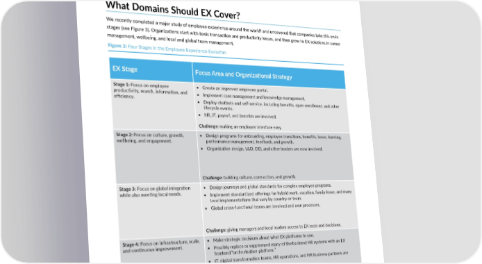 Today, most big companies have an EX team or owner, and this person is both a designer and service delivery leader. They no longer want to buy dozens of tools and apps; they want a “system” to work with, a real pla琀昀orm that brings all these solu琀椀ons together. As with every other market in HR, this market has shi昀琀ed from that of “tools” to that of “pla琀昀orms,” and that’s why big vendors like ServiceNow, Microso昀琀, and others have entered the market. What Domains Should EX Cover? 4 We recently completed a major study of employee experience around the world and uncovered that companies take this on in stages (see Figure 3). Organiza琀椀ons start with basic transac琀椀on and produc琀椀vity issues, and then grow to EX solu琀椀ons in career management, wellbeing, and local and global team management. Figure 3: Four Stages in the Employee Experience Evolu琀椀on EX Stage Focus Area and Organiza琀椀onal Strategy Stage 1: Focus on employee • Create an improved employee portal. produc琀椀vity, search, informa琀椀on, and • Implement case management and knowledge management. efficiency. • Deploy chatbots and self-service, including benefits, open enrollment, and other lifecycle events. • HR, IT, payroll, and benefits are involved. Challenge: making an employee interface easy. Stage 2: Focus on culture, growth, • Design programs for onboarding, employee transi琀椀ons, benefits, leave, learning, performance management, feedback, and growth. wellbeing, and engagement. • Organiza琀椀on design, L&D, DEI, and other leaders are now involved. Challenge: building culture, connec琀椀on, and growth. Stage 3: Focus on global integra琀椀on • Design journeys and global standards for complex employee programs. while also mee琀椀ng local needs. • Implement standardized offerings for hybrid work, vaca琀椀on, family leave, and many local implementa琀椀ons that vary by country or team. • Global cross-func琀椀onal teams are involved and own processes. Challenge: giving managers and local leaders access to EX tools and decisions. Stage 4: Focus on infrastructure, scale, • Make strategic decisions about what EX pla琀昀orms to use. and con琀椀nuous improvement. • Possibly replace or supplement many of the backend HR systems with an EX frontend “orchestra琀椀on pla琀昀orm.” • IT, digital transforma琀椀on teams, HR opera琀椀ons, and HR business partners are involved. Challenge: crea琀椀ng global alignment between local businesses and global service centers. Source: The Josh Bersin Company, 2022 4 The De昀椀ni琀椀ve Guide: Employee Experience, Josh Bersin and Kathi Enderes, PhD/The Josh Bersin Company, 2022. The Rise of the Employee Experience Pla琀昀orm: Essen琀椀al to Business Success | Copyright © 2022 The Josh Bersin Company 4 All rights reserved. Not for distribu琀椀on. Licensed material.